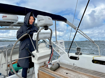 Unter Sturmfock und dem Groß im dritten Reff rauschen wir durch den Schärengarten. Ich bin in meinem Element, während Shaima ab und an sorgenvoll zu mir herüberblickt. Meist, wenn Aris Segel sich nach einer Abdeckung wieder mit Wind füllen und sie sich auf die Seite legt um rasch an Fahrt zu gewinnen. Keine Sorge, wir segeln hier nicht am Limit! Ari bleibt jederzeit zahm und ist keineswegs übertakelt. Es sind nur ungewohnte und vor allem für Shaima neue/unbekannte Bedingungen. Dann folgt ein Stück hoch am Wind über die ungeschützte Ostsee und ich beginne dann doch mich schuldig zu fühlen. Es ist zu keinem Zeitpunkt gefährlich, aber schon sehr sehr fordernd. Habe ich mich falsch entschieden und die beiden unnötigen Strapazen ausgesetzt? Die wenigen Meilen sind wirklich eklig und ziehen sich. Aris wiederholtes hartes Eintauchen und abbremsen strengt an. Die überkommende Gischt und das geringe Tempo zehren zusätzlich. Uns dreien vergeht jeglicher Appetit und die Laune geht in den Keller.